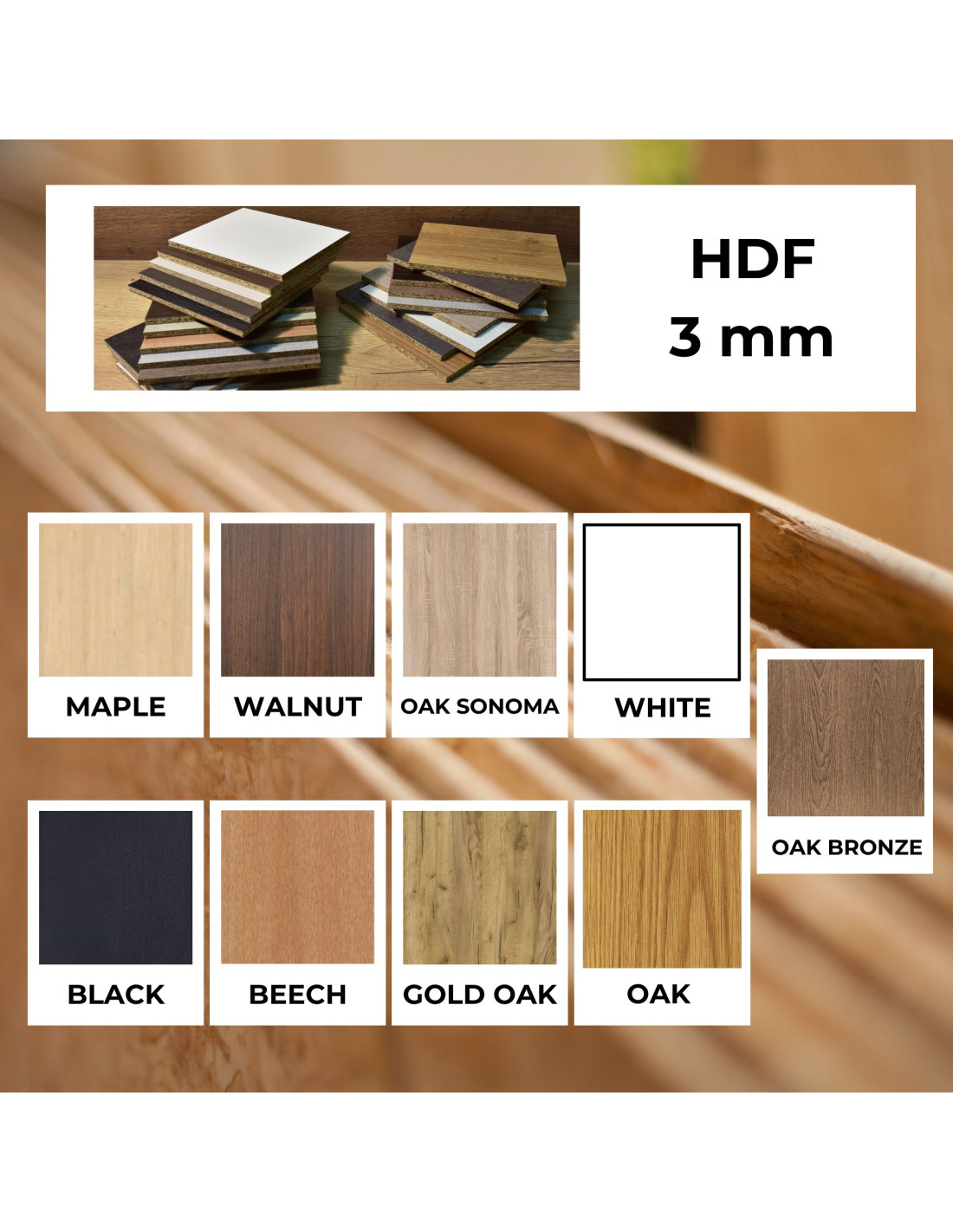 • Plywood has a thickness of 5 mm / HDF has a thickness of 3 mm.