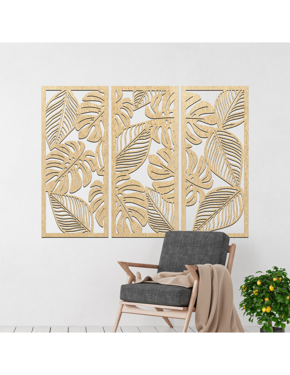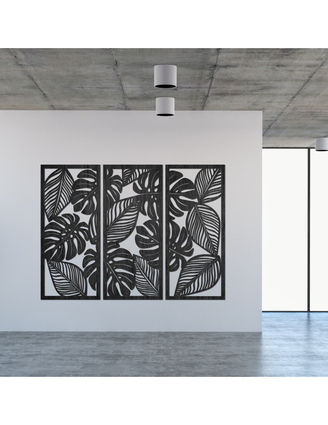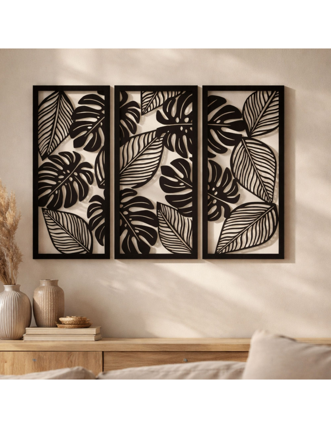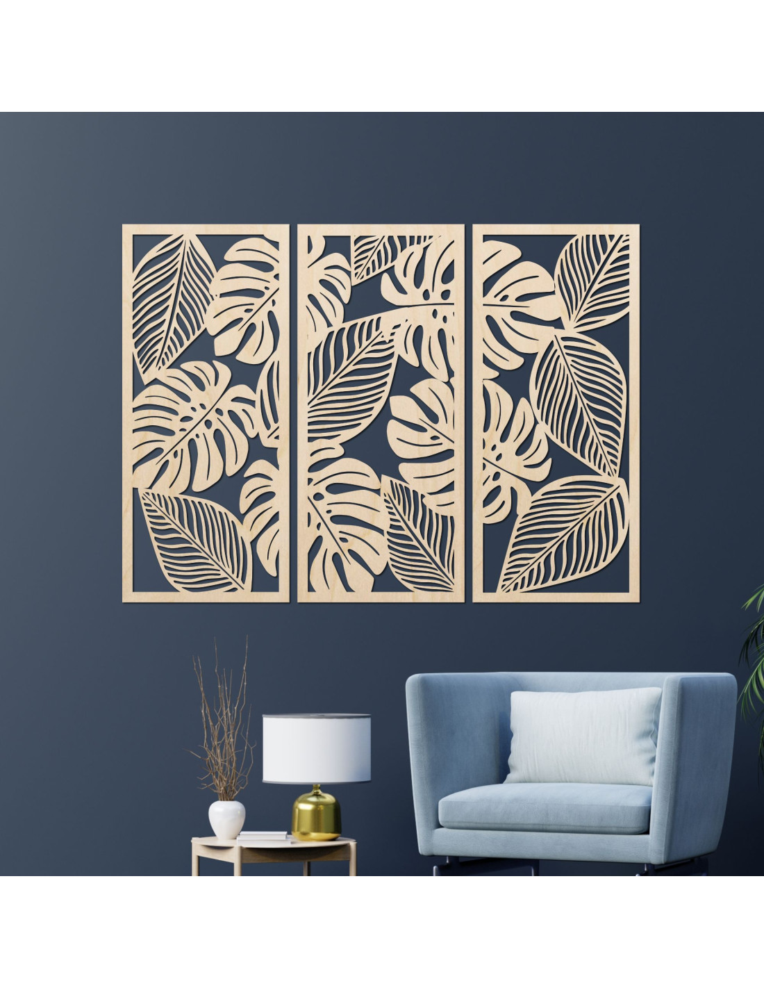 Modern wall decoration: three panels with cutouts of monstera leaves.
