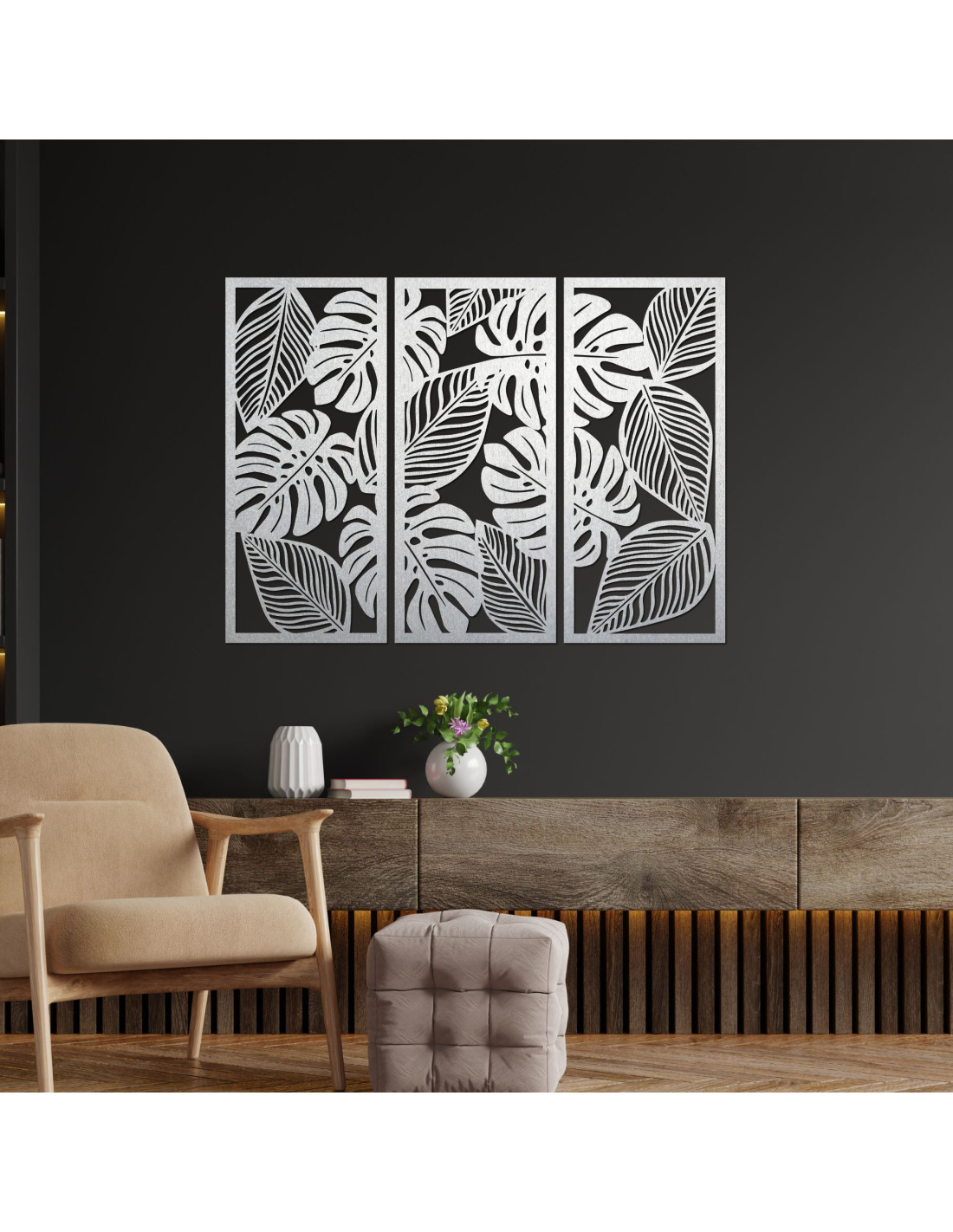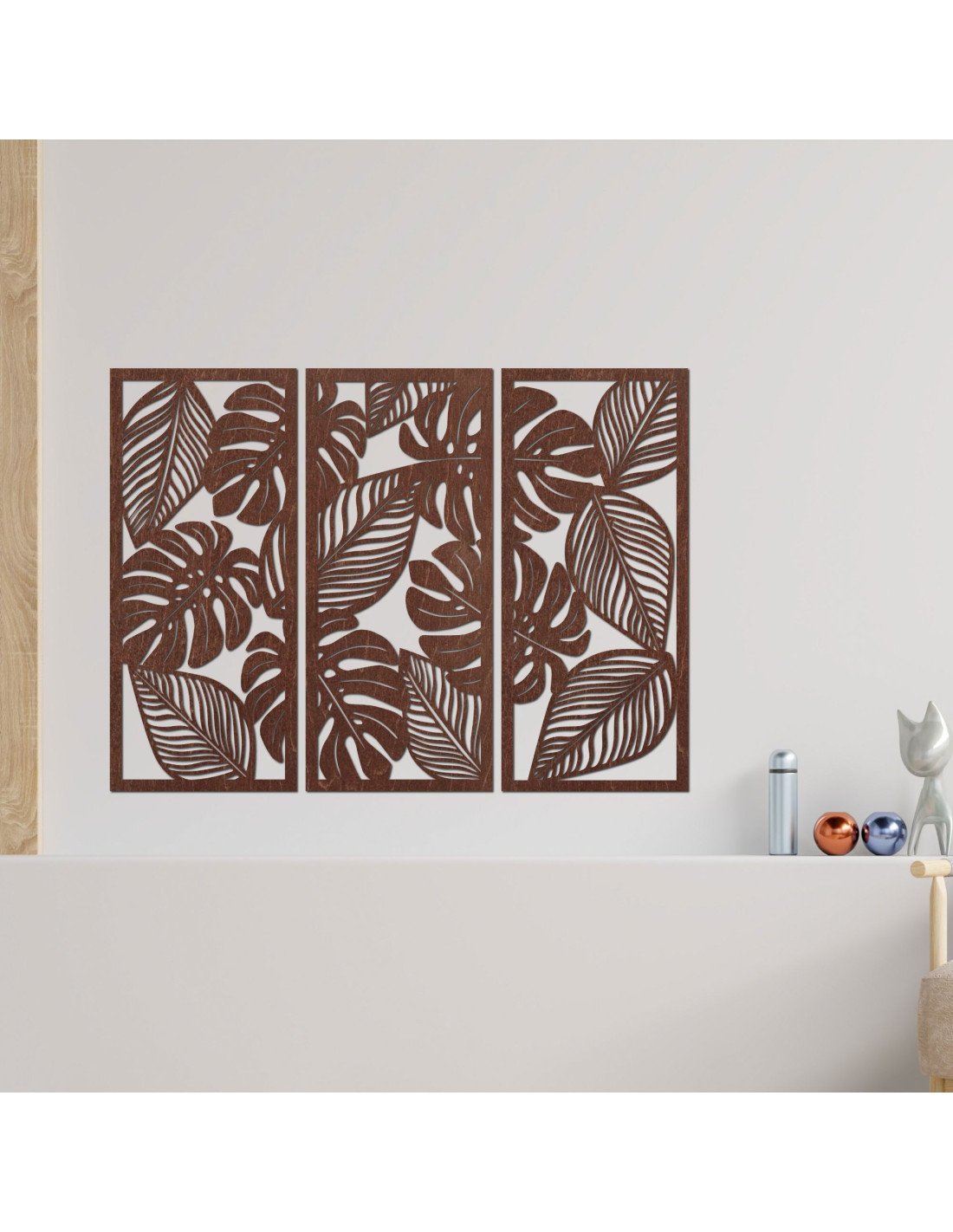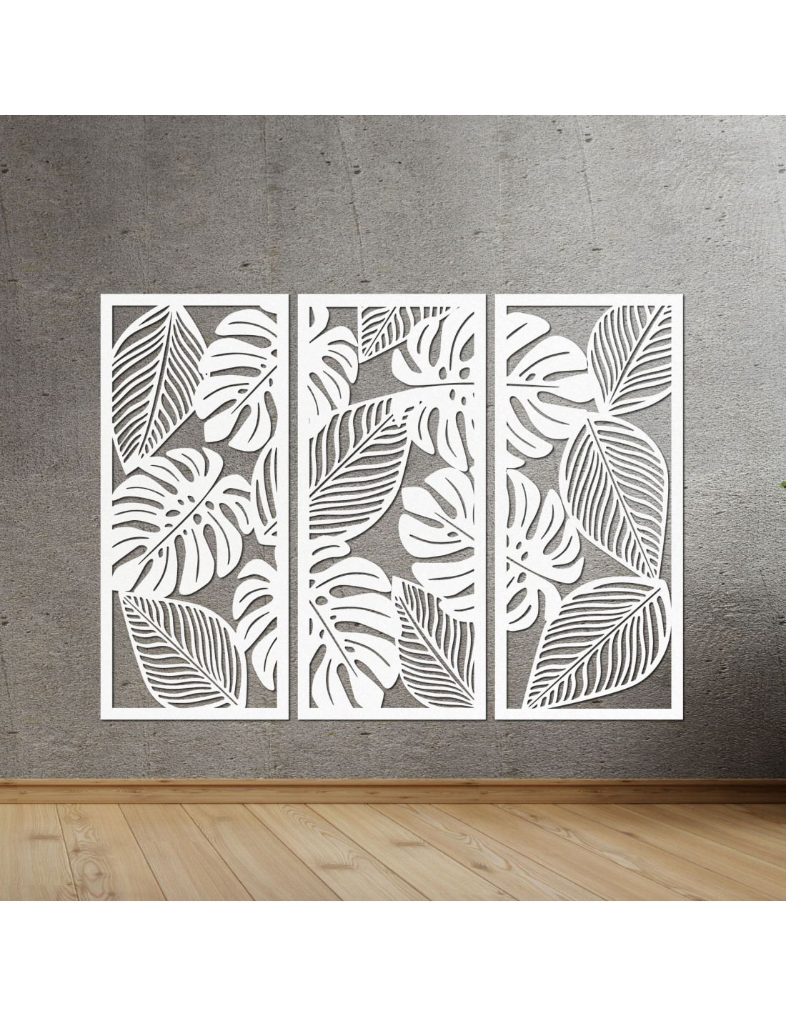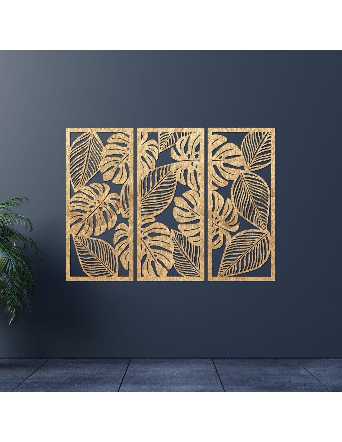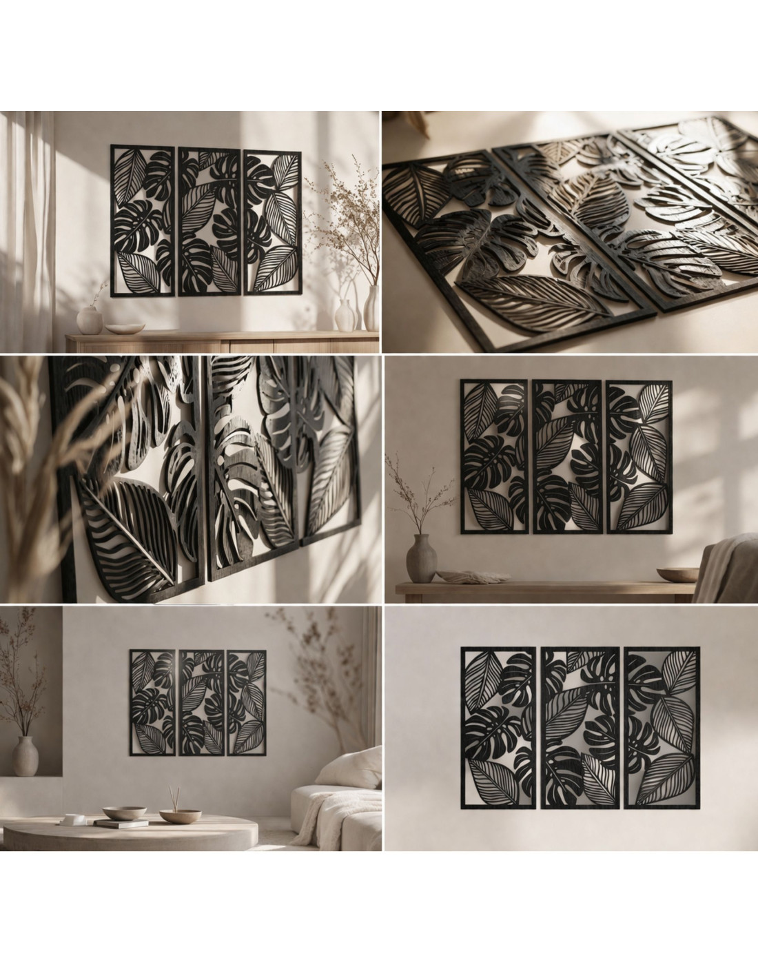 Modern wall decoration: three panels with cutouts of monstera leaves.