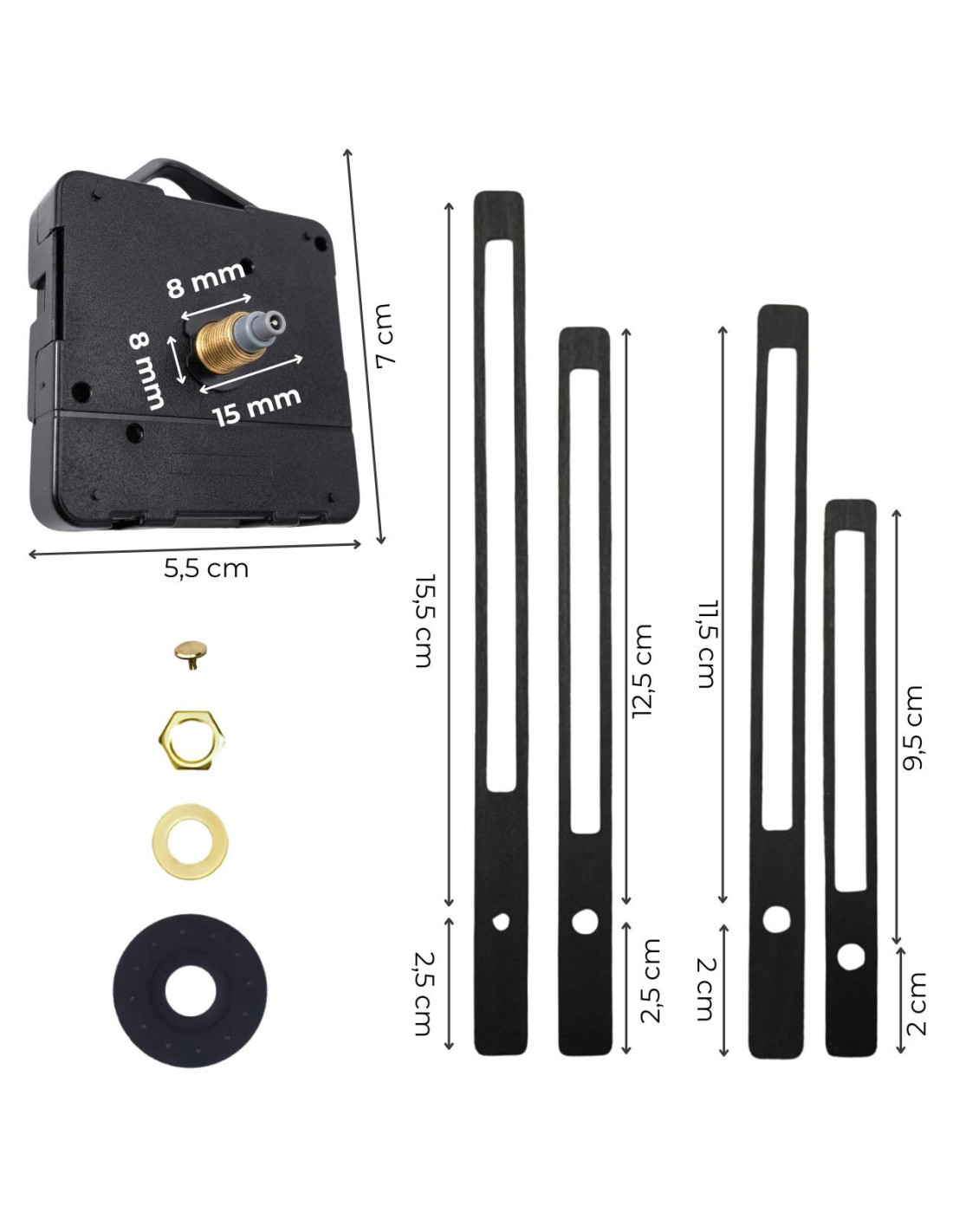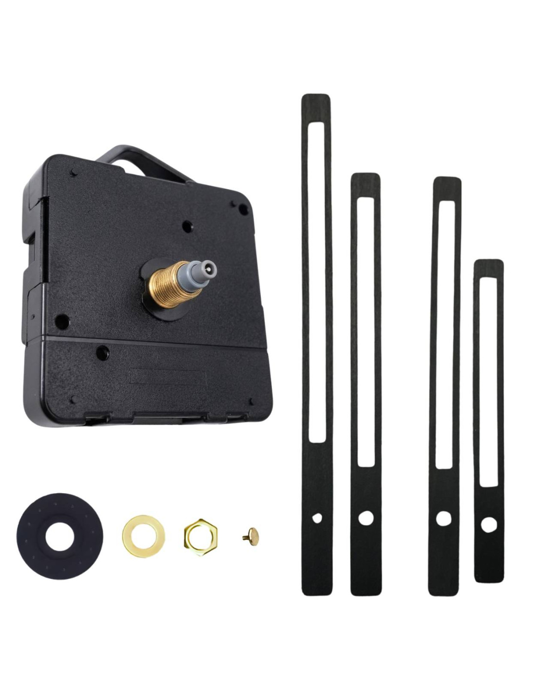 - Set contents: rubber washer, metal washer, center nut, blind nut, QUARTZ movement, hour and minute hands
