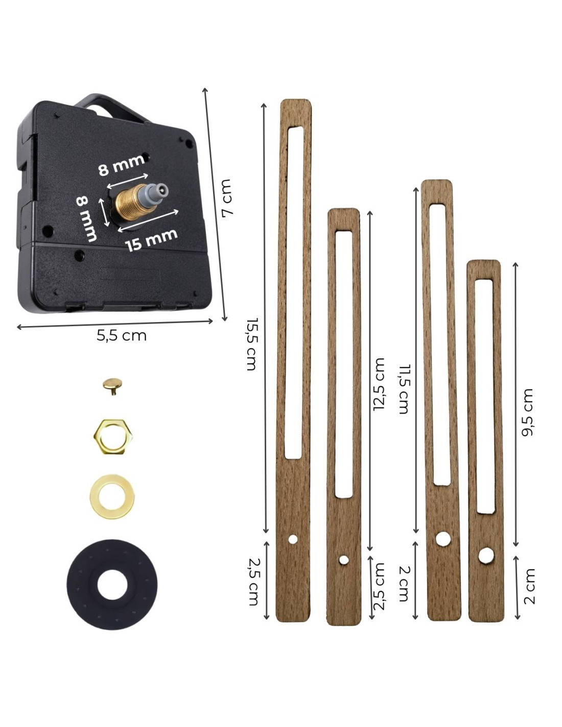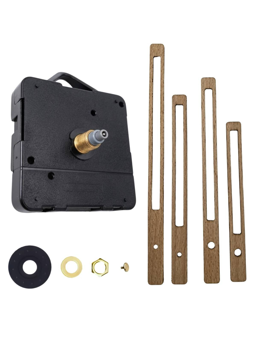 - Set contents: rubber washer, metal washer, center nut, blind nut, QUARTZ movement, hour and minute hands