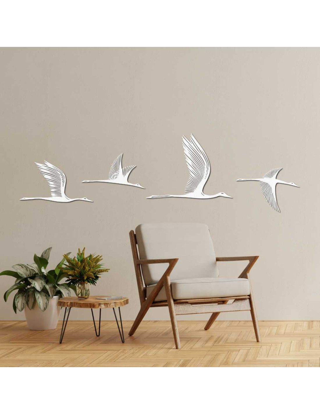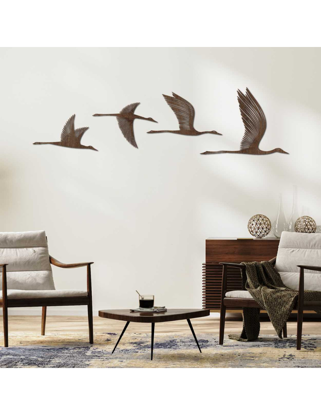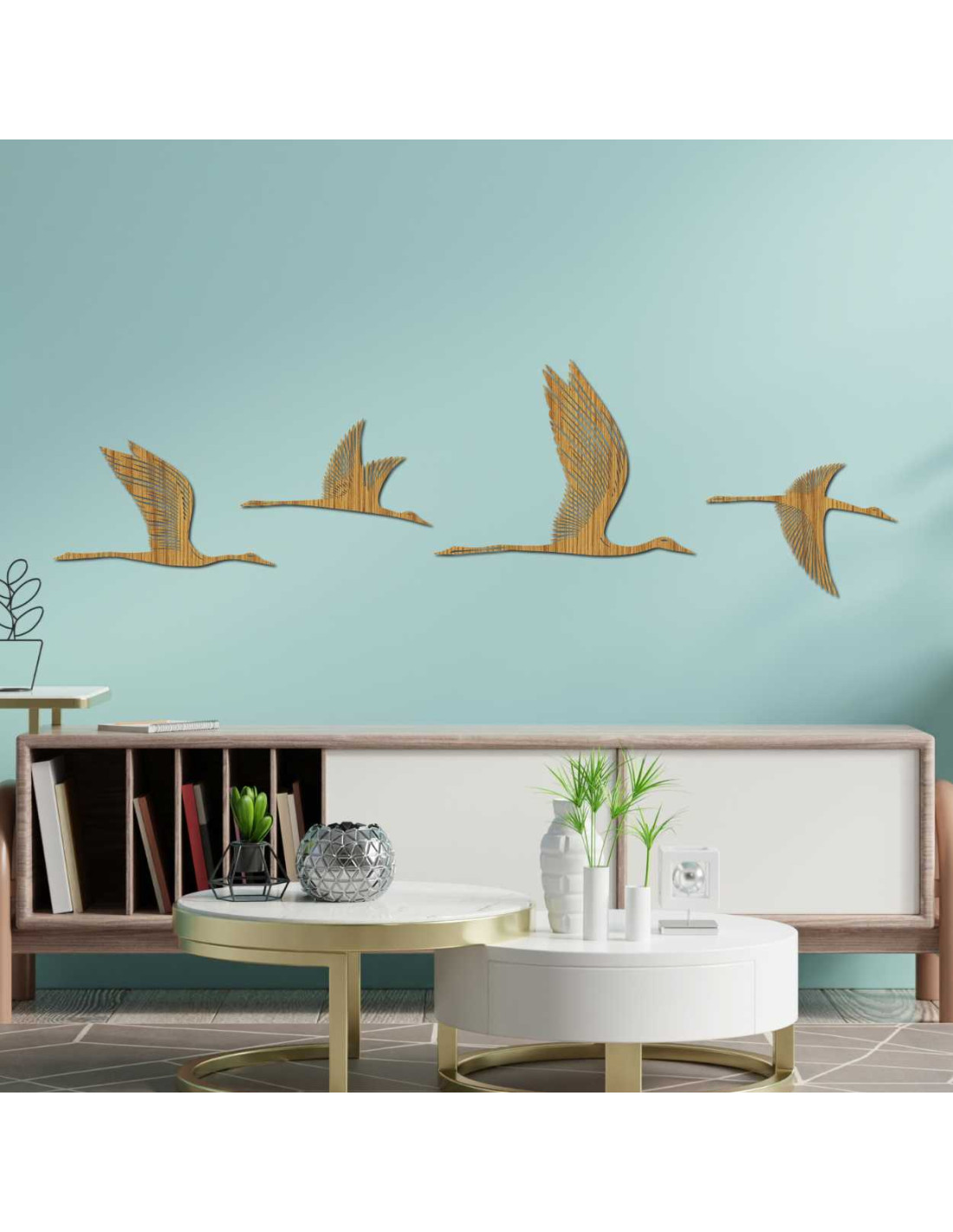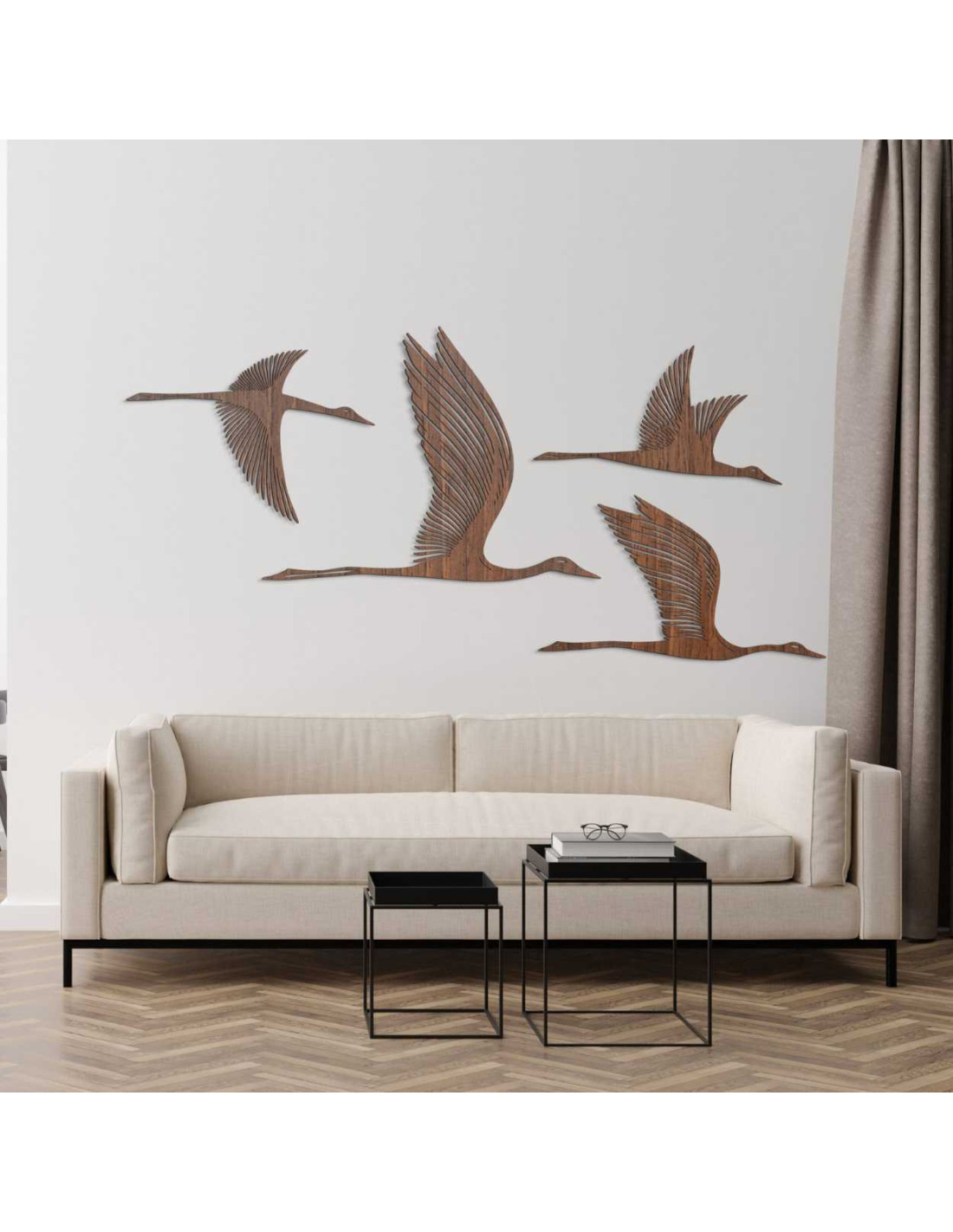 A wooden painting with a stylish motif of birds in flight adds deep aesthetic meaning to the room.
