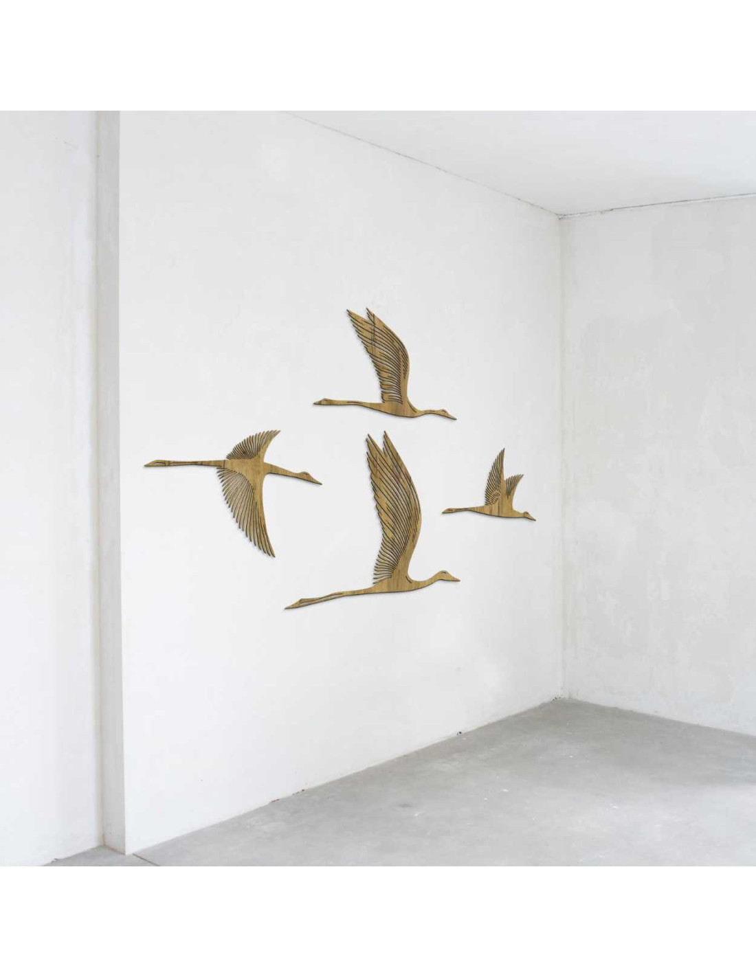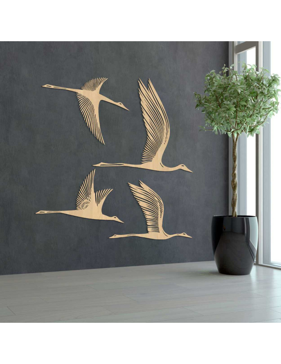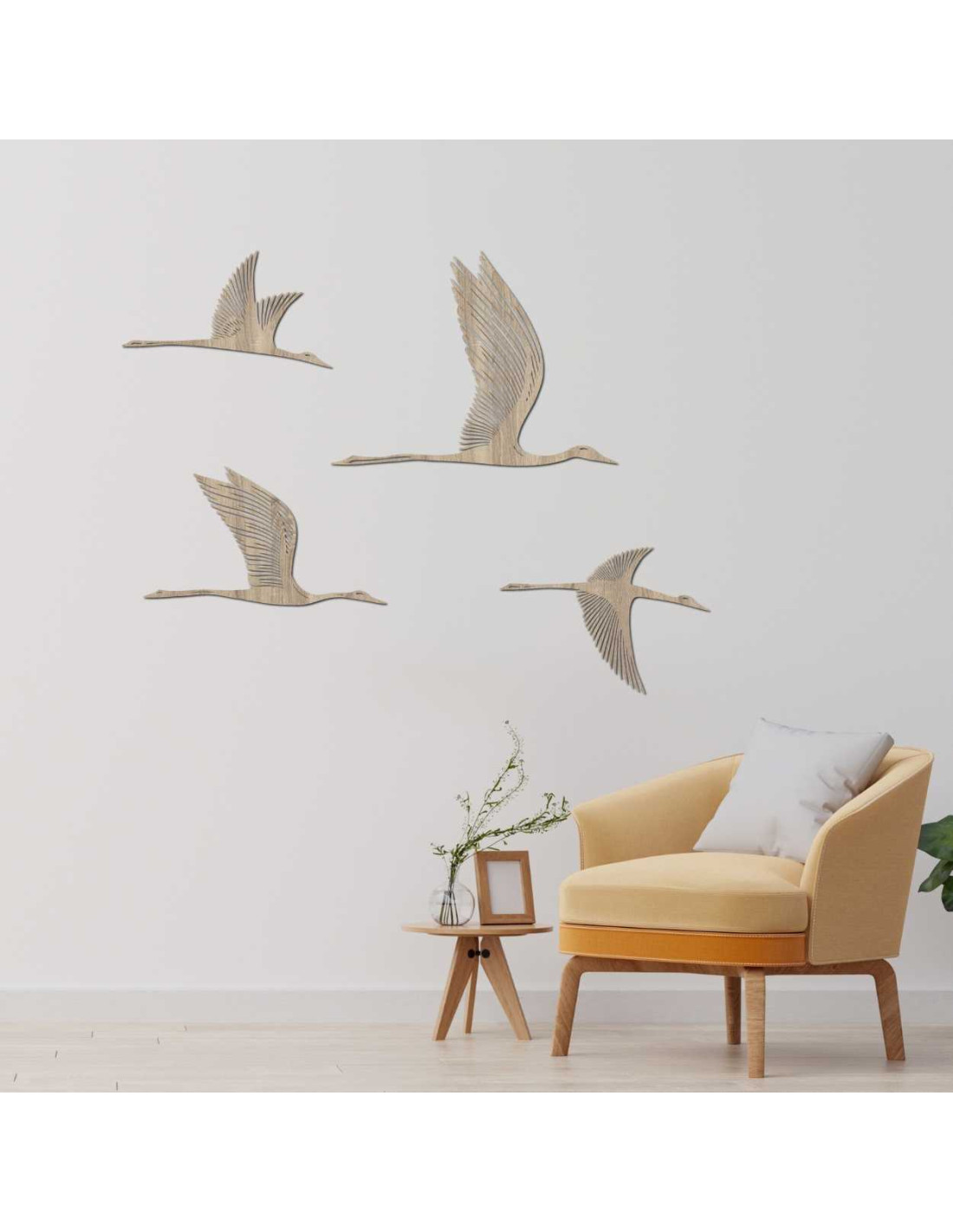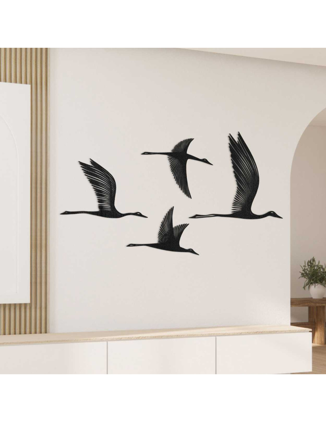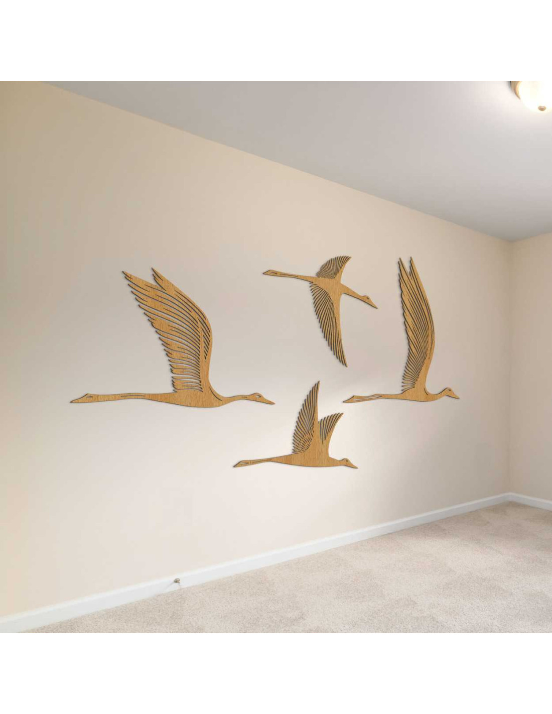 A wooden painting with a stylish motif of birds in flight adds deep aesthetic meaning to the room.