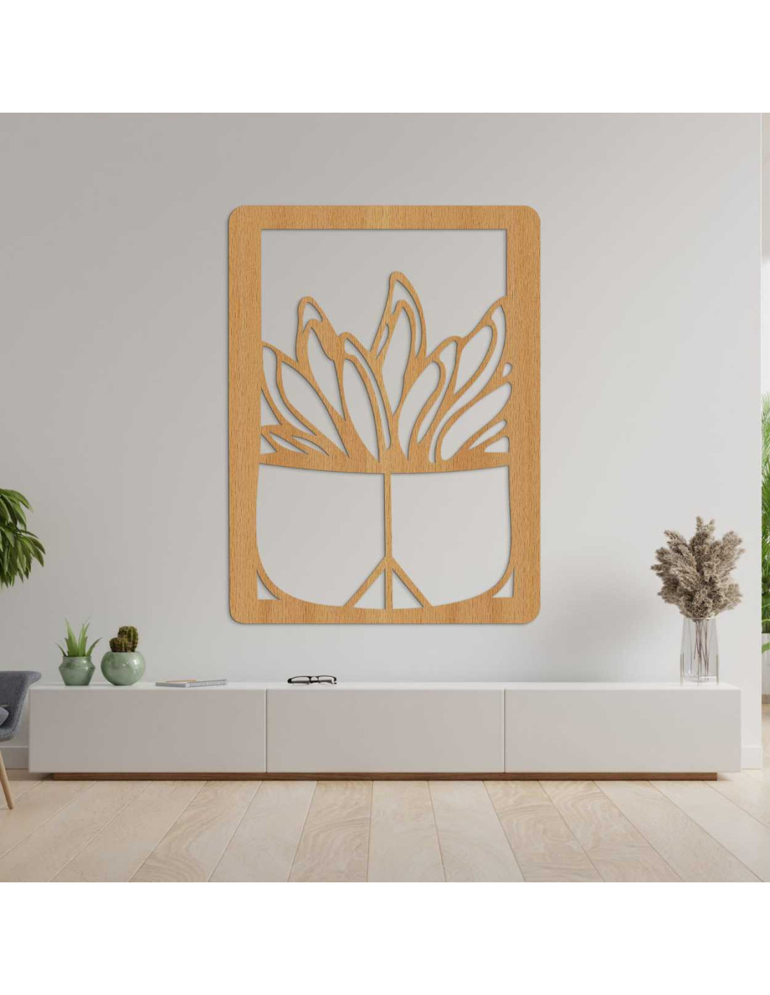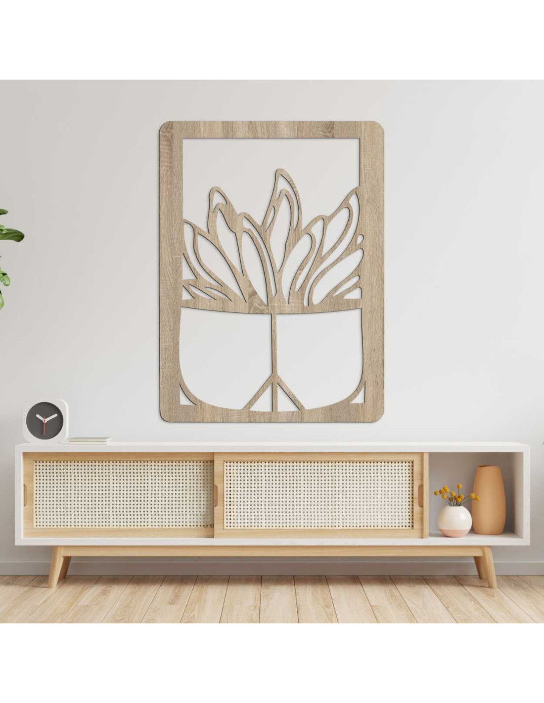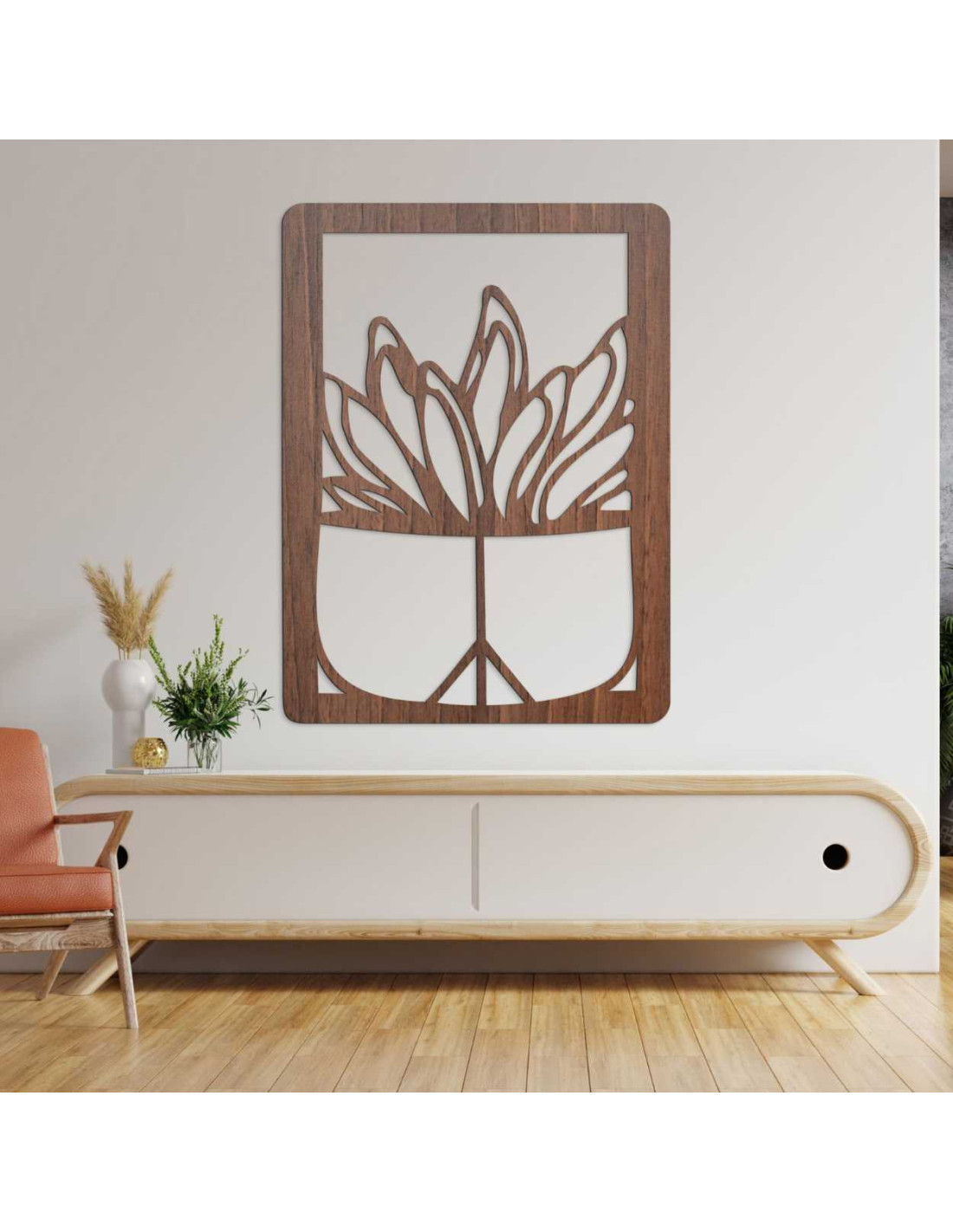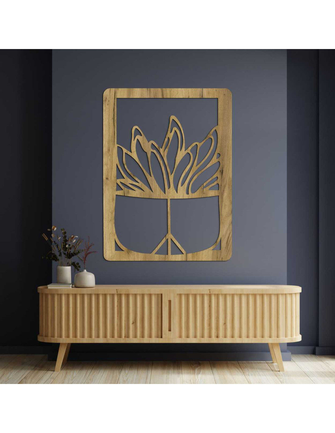 Wooden wall painting - Plant in a pot | Modern wood carving for the interior - GEERA