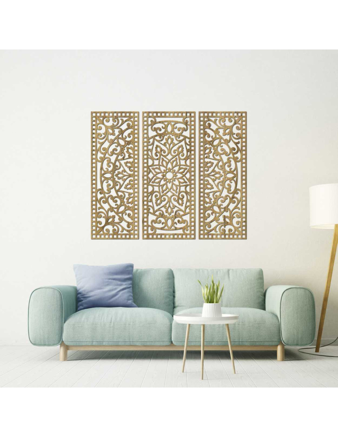 Floral Mandala Wood Wall Art Set: Boho Chic Carved Triptych